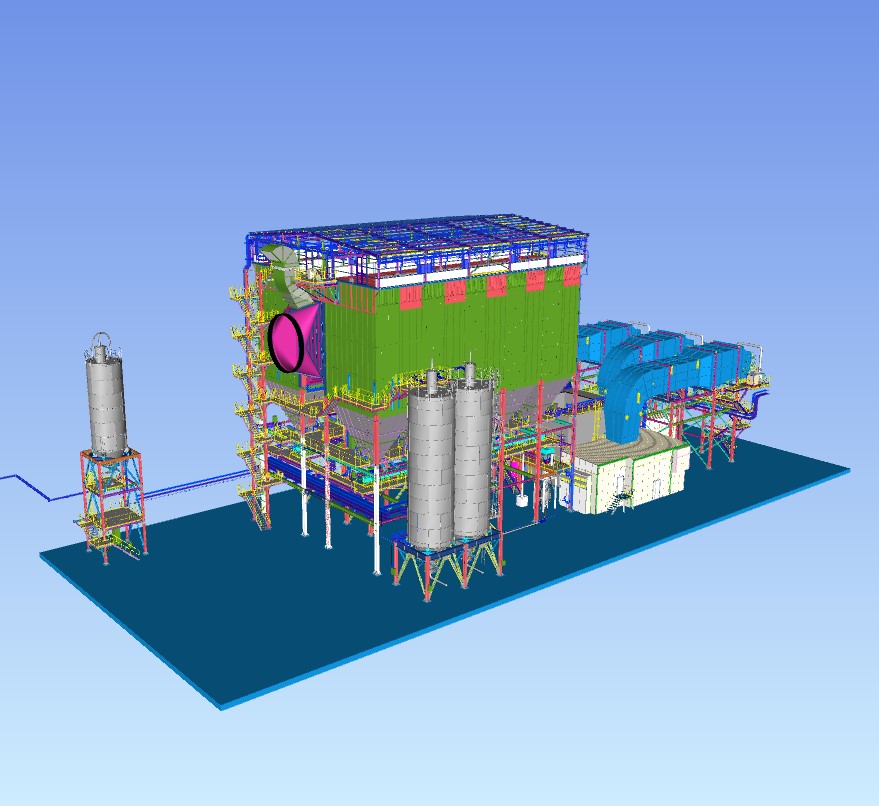 Impianto Filtrazione Fumi Cliente: BoldrocchiPeso: 1000 Tonn.Ambito: Calcolo della struttura e dei condotti, progettazione e realizzazione del modello tridimensionale Tekla ed estrazione dei disegni di officina.