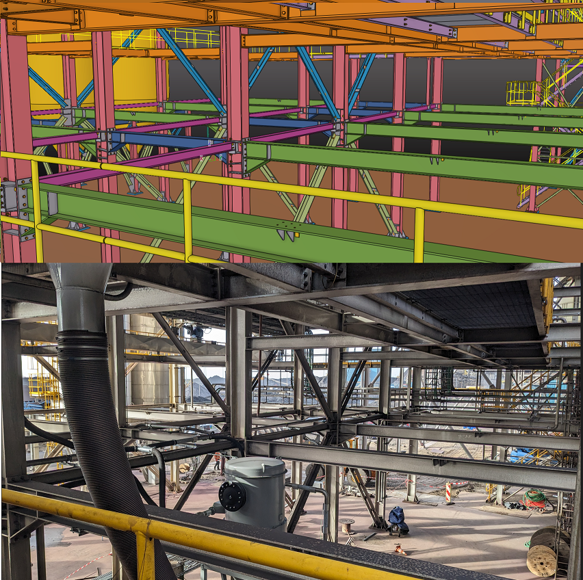 Successivamente, la nuvola di punti è stata ottimizzata, esportata e confrontata con il modello digitale Tekla, che è stato aggiornato in base alle modifiche apportate alla struttura esistente.